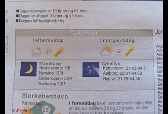 A la suite de cela, j'ai équipé mon vélo de lampes à aimants et j'ai aussi répéré dans un journal une section "météo du cycliste". En plus de la direction et force du vent, un utile petit tableau indique sous la rubrique "Cykellys" (lampe de vélo) les heures officielles d'allumages de lampes pour les plus grandes villes danoises. Si quelqu'un sait où trouver cette info sur Internet, je suis preneuse.