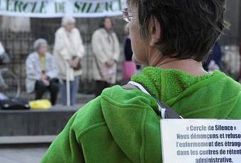Alors on se rapproche... et on lit leur pancarte "Cercle de Silence" Nous dénoncons et refusons l'enfermement des étrangers dans les centres de rétention administrative.