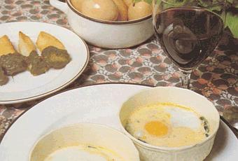 - Prendre une plaque à petits bords, poser les ramequins dans 1 cm d’eau, porter à ébullition et faire cuire environ 3 minutes. Servir chaud avec des croûton de pain beurré.