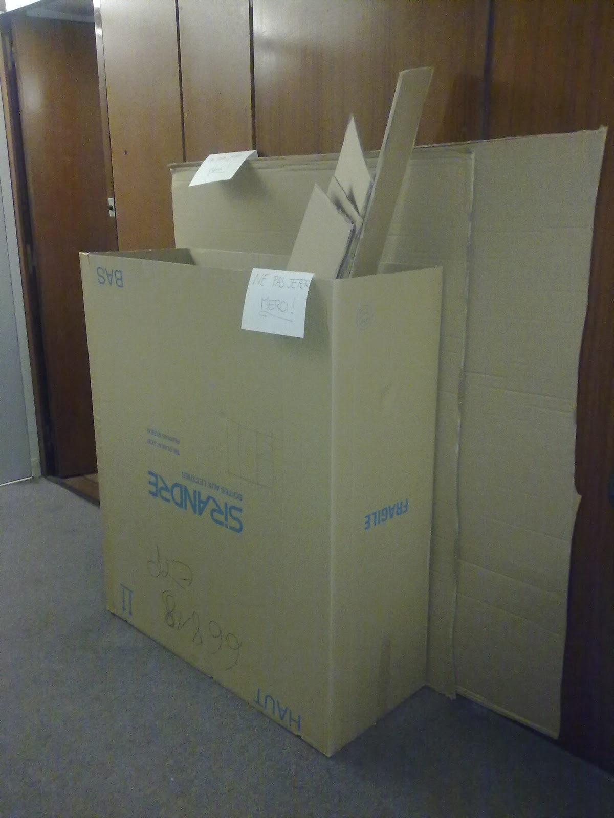 Dans mon immeuble, ils refont tous les halls, ainsi que... les boîtes aux lettres ! Je rêvais de ces immenses boîtes dont certaines mesurent 120cm par 150cm sur le plus grand côté ! Pas abîmées, grandes, en bas de chez moi, que demander de plus ? J'ai donc demandé la permission aux ouvriers de récupérer ces cartons ! Ça leur fera un aller-retour en moins jusqu'à la cave et ça fera une passionnée de déco heureuse ;)