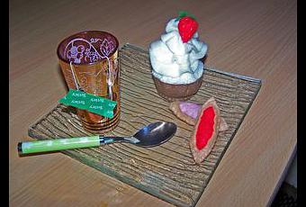 L'assiette, le verre à thé et la cuillère sont "normaux"... mais le cup-cake et les barquettes sont issus des dernières créations d'Anaïs : la dinette en feutrine. (cliquez sur l'image pour agrandir)