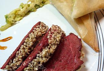 Dégraissez légèrement le côté des magrets, retournez les côtés gras dessus et quadrillez les avec la lame du couteau. Placez les sur une assiette côtés chair dessus, salez légèrement et étalez une bonne couche de miel. Parsemez de sésame et laissez mariner au minimum 30 minutes. Pendant ce temps, lavez les blancs de poireaux, coupez les en deux et émincez les. Dans une casserole, faites fondre une noix de beurre, faites revenir sans coloration les poireaux pendant 5 minutes. Ajoutez 2 cc de miel, une pincée de sel et la crème, remuez et poursuivez la cuisson 2 minutes à feu doux. Réservez. Prenez une feuille de brick, rabattez un bord vers le centre puis l’autre de manière à obtenir une bande rectangulaire. Placez un peu de poireaux sur un bord et commencez à plier la feuille de brick comme pour réaliser des samosas. Faites fondre un peu de beurre et badigeonnez le de chaque côté puis placez le sur un plaque allant au four. Recommencez pour toutes les feuilles de brick. Chauffez une poêle sans matière grasse et une fois bien chaude placez le magret côté gras et laissez cuire 4 minutes sans le retourner. Préchauffez le four à 180°C et placez en même temps un plat à gratin pour qu’il soit bien chaud. Otez la viande de la poêle, placez la sur une assiette et laissez la reposer 5 minutes, puis sortez le plat du four et déposez les magrets à l’intérieur et enfournez pour 15 minutes avec la plaque contenant les croustillants. Sortez la viande, éteignez le four, entrebâillez le en laissant les croustillants au four pour les garder au chaud, puis placez les magrets sur une assiette et laissez les reposer 5 minutes avant de les découper en tranches fines. Déposez dans chaque assiette, 3 à 4 tranches de magret, 2 croustillants et servez.