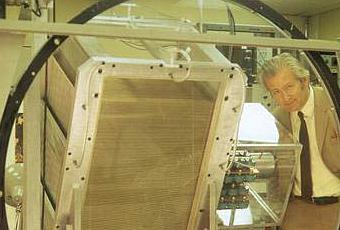 Georges Charpak au CERN derrière une chambre proportionnelle multifilaire (© CERN 1973)