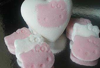J ai pris un peu de la texture que j ai coloré en rose ,puis aplati et fais mon motif avec un emporte pièce kitty une fois fais je l ai glissé délicatement dans le fond du moule, et mis le reste de ma pâte blanche et fais ma bombe de bain classique
