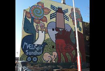 Dans la série Les Danois aiment le lait, voici une petite peinture murale proclamant les vertus de ce breuvage: Mælk gir' sundhed (le lait, ça donne la santé!). Enfin ne vous inquiétez pas, les murs ne vantent pas que les mérites des boissons sans alcool... (à suivre)