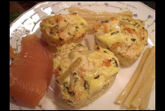On émiette le saumon refroidi. On coupe les minis asperges en morceaux. On mélange le lait et les oeufs. On y ajoute le saumon et l’estragon (et là on lésine pas ça donne du goût)