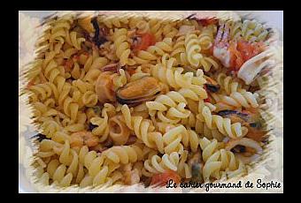 Faire cuire les pâtes, égoutter et verser sur les fruits de mer.