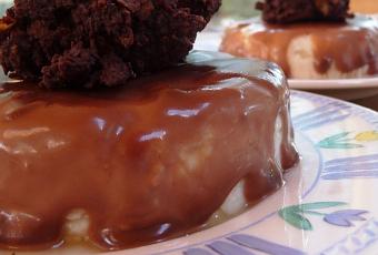 Démoulez le mousseux de poire sur une assiette. Déposez un croustillant sur chacun et recouvrir de ganache au caramel !!!