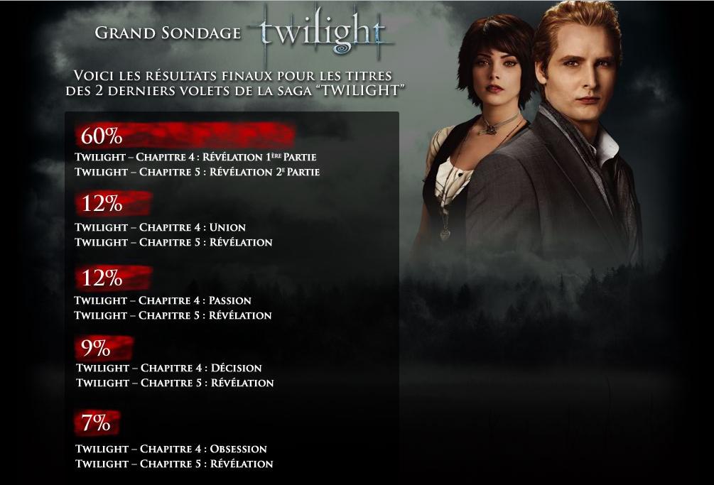 60% ont voté pour :- Chapitre 4 : Révélation 1 ère partie- Chapitre 5 : Révélation 2 ème partie 12% ont voté pour :- Chapitre 4 : Union- Chapitre 5 : Révélation12% ont voté pour :- Chapitre 4 : Obsession- Chapitre 5 : Révélation9% ont voté pour :- Chapitre 4 : Décision- Chapitre 5 : Révélation7% ont voté pour :- Chapitre 4 : Union- Chapitre 5 : RévélationLes deux derniers volets se nommeront donc :