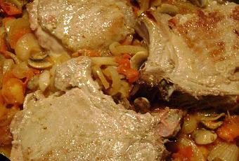 5) Mettre les côtelettes avec la garniture, saler, poivrer. Servir bien chaud