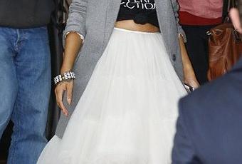Dans la capitale de l’audace vestimentaire, Rihanna portait une veste grise avec assortie d’un tee-shirt noué, d’une jupe blanche en tulle…