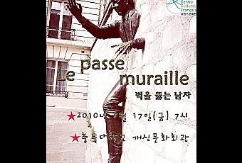 Le 17 septembre 2010 à 19 heures, le Vin Bleu (le nom de troupe de théâtre amateur de notre département de langue et de littérature française de ’ Université Nationale de Chungbuk a joué la comédie musicale « Le Passe-muraille » une adaptation du spectacle musical écrit par Didier van Cauwelaert et Michel Legrand en 1997 ’après la nouvelle de Marcel Aymé.. C’est la 4ème œuvre que nous mettons en scène. L’année dernière nous avons joué « Don Juan », l’année d’avant « Notre Dame de Paris » et notre premier spectacle était « Roméo et Juliette.»