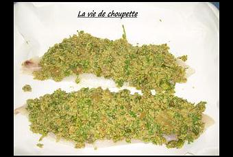 Faites chauffer une grande quantité d'eau dans un cuit vapeur, pelez les carottes et émincez-les en tagliatelles. Rincez les filets de dorade et séchez-les. Disposez-les côté peau dans un plat à four huilé, recouvrez-les de pâte verte et enfournez 12min.