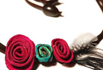 Les colliers sont faits de suède, plumes et fleurs en cuir d’orange… et oui orange! Et en plus ça sent l’orange! Des fleurs qui sentent l’orange, c’est surprenant et magnifique!