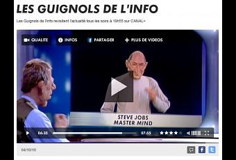 Après une première apparition remarquée vendredi dernier, la marionnette de Steve Jobs est de nouveau entrée en scène hier lors de la quotidienne des Guignols de l’info sur Canal.
