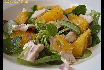 Pour 4 personnes : 2 blancs de poulet, 2 brins de menthe, 2 oranges, 100g de mâche, 1