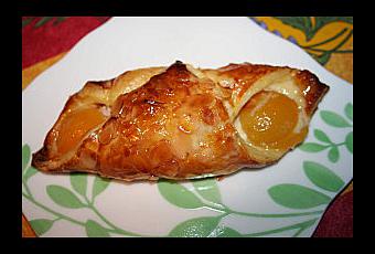 Etalez la crème sur la pâte et y mettre 3 demi-abricots bien égouttés sur la diagonale d'un carré.