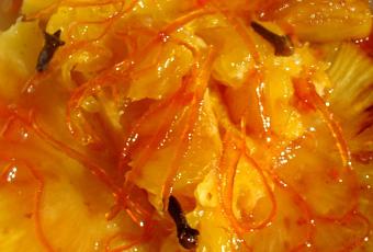 Eplucher l’ananas, le couper en demi-rondelles. Les faire poêler quelques minutes dans le mélange beurre/huile chauds.