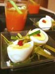 Oeufs de caille sur fondue de poireaux ; gaspacho potiron et carotte à la cannelle ;
