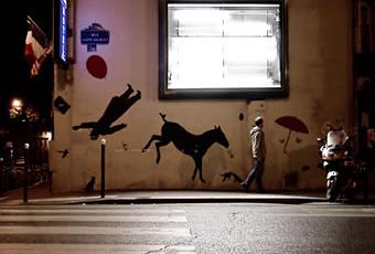 [I saw this advertising hoarding during a velib tour. Without any illustration, it becomes a huge projector. A nice opportunity to capture this lovely street art with enough light to illuminate the whole scene...