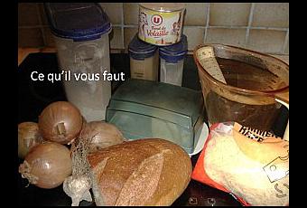 . Prendre des bols allant au four et mettre du pain dans le fond (coupé en morceaux), un peu de gruyère râpé (si vous aimez !) et versez le mélange d’oignons.