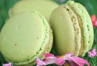 J'ai joué à fond le jeu "recette de l'école Ducasse" en reprenant intégralement la recette de la garniture qui est à base de crème au beurre. la crème au beurre, c'est la vrai, à la française, avec de l'œuf... celle qui, en trop grande quantité peut être écœurante. Je ne l'utiliserai pas pour un gâteau, pour un gâteau, je prendrai plutôt cette recette (à l'américaine, sans œuf).Pour ce qui est de la couleur... du vert, en pâte, dans la meringue au milieu du montage. Attention parce que comme c'est souvent le cas pour les couleurs pastels, ça jaunit pendant la cuisson à cause de la chaleur. Baissez un peu la température du four et allongez la cuisson de quelques minutes (1 ou 2..).Pour une trentaine de macarons, il vous faut:- une soixantaine de coques vert pistache