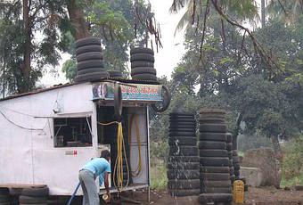 Ma première réflexion est alors de me demander mais qu’est ce que je vais bien pouvoir faire de ce pneu à bout de souffle? La magie Indienne opère car ici « tout est possible », mais tu le sais déjà. Par chance je connais un peu le quartier, puisque j’étais pas vraiment loin de chez moi. Et après 5 min de route de tout mon poids calé sur l’avant de la moto, roue arrière crevé oblige , me voilà devant un « Punch Workshop ». De petits « casot’ »métalliques comme il y en a fréquemment et dans lesquels de vaillants Messieurs Kumar s’agitent à réparer les pneus des voyageurs en détresse! Il t’en coutera 150 Rs de chambre à air et 50 Rs de main d’œuvre. Si la crevaison ne nécessite pas de nouvelle chambre à air, « Rustine » is there!
