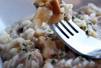 Après 15 mn environ, ajouter les cèpes sautés, et cuire encore 5 mn, toujours en remuant constamment : vérifier la cuisson du riz, qui doit être al dente, et retirer du feu.