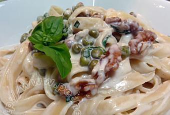 Dans un grande casserole d’eau bouillante salée, faites cuire les tagliatelles le temps indiqué sur le paquet. 3 minutes avant la fin de cuisson, ajoutez les petits pois. Égouttez. Dans une casserole, faites fondre ensemble les fromages, ajoutez la crème. Une fois que vous avez obtenu une belle sauce, poivrez, salez légèrement et ajoutez les noix. Versez les tagliatelles, ajoutez le basilic, mélangez et servez sans attendre.