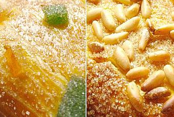* Badigeonnez les fougasses de jaune d'oeuf. Ajoutez les fruits confits sur l'une. Les pignons de pin sur l'autre ou tout autre garniture de votre choix.