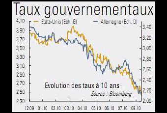 Dans le billet sur l'immobilier publié ici, j'avais indiqué la baisse sans précédent des taux, pour expliquer les reccords inégalés de l'immobilier. Voici par l'immage la variations des taux depuis un an, aux USA et en Allemagne (le pays le mieux noté de l'Europe). C'est extrêmement spectaculaire.