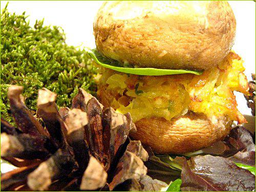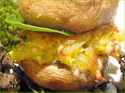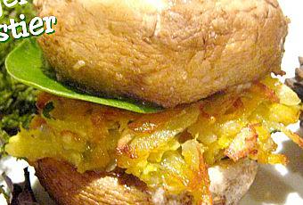 Pour les détails, Burger Forestier (des champignons de Paris à farcir en guise de pain) & son steak (comme un rösti) de topinambour, pomme de terre & courge butternut.