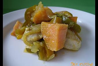 Pour 4 personnes: 1 kg filet de poulet coupé en morceaux, 1 kg de patates douces, 1 poivron vert, 4 cs d'huile d'olive, 2 oignons, 1,5 cc de sel, 1/2 cc de poivre, 1/2 cc de curcuma, 1 cc de gingembre, 250 ml d'eau- Couper les oignons en 2, les éplucher, les rincer puis les couper en tranches pas trop fines. Couper les extrémités du poivron, l'inciser pour l'ouvrir. Retirer graines et peaux blanches. Couper dans la largeur en lanières pas trop fines. Éplucher les patates douces, les couper en deux dans la longueur puis en gros morceaux.