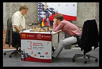 Ci-contre, le norvégien Magnus Carlsen tentera tout pour l'emporter ronde 3 face à l'Espagnol Alexei Shirov, mais en vain : nulle en 175 coups ! © Site officiel