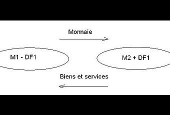 Imaginons deux communautés C1 et C2 possédant chacune leur propre système monétaire. Elles font circuler M1 et M2 comme masse monétaire dans leur circuit. Puis C1 et C2 se rendent compte qu'elles ont des échanges à se faire entre elles, mais ne bâtissent pas de monnaie commune pour cela, elles achètent avec leur propre monnaie. Imaginons alors que C1 se trouve en déficit par rapport à C2, alors M1 va décroître de dF1 dans C1, tandis que C2 va se voir doter d'un surplus monétaire M2 + dF1...