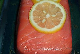 Au moment de servir, démouler la terrine sur un plat de service, et déposer par-dessus des rondelles de citron.