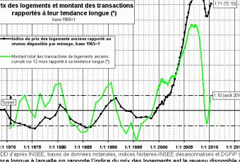 Jacques Friggit, chargé de mission au Conseil général de l’environnement et du développement durable scrute l’évolution depuis 1965 du revenu disponible par ménage sur l’ensemble de la France et l’indice du prix des logements anciens en France. « De 1965 à 2000, l’indice du prix des logements anciens a augmenté approximativement comme le revenu par ménage et a évolué dans un « tunnel » autour de ce dernier. » observe-t-il. Mais, depuis le début des années 2000, on assiste à une envolée du prix des logements anciens rapporté au revenu des ménages.