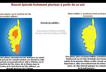 Une nouvelle onde perturbée remonte des Baléares en direction du Sud-Est de l'île. Les pluies reprennent et se renforcent rapidement. Elles pourront prendre un caractère orageux et s'étendre vers le Sud-Ouest de l'île. En début de nuit, ces fortes pluies gagnent le Nord de l'île, et concernent tout le Département de Haute-Corse. Les pluies sont plus souvenues sur le Nord de l'île en fin de nuit.