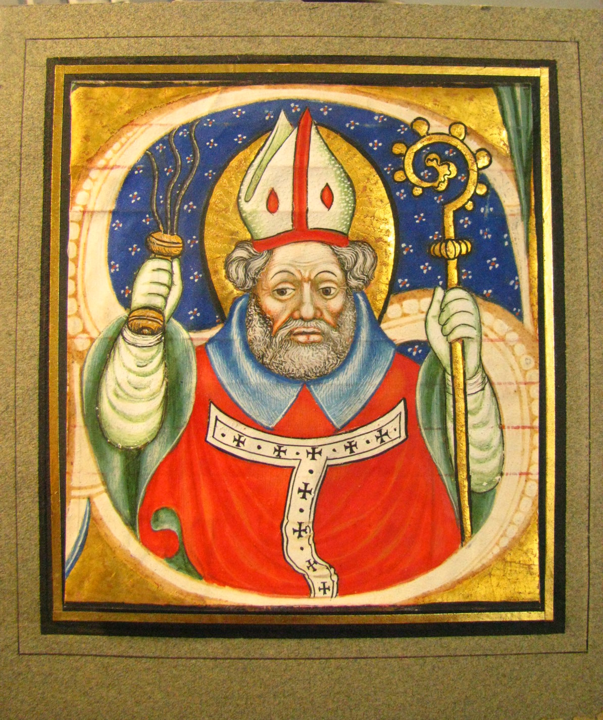 Les traits des deux saints sont quasiment identiques : mêmes regards en coin, mêmes lèvres charnus, mêmes pommettes hautes et saillantes, mêmes sourcils, mêmes moustaches, même positionnement des cheveux sous la mitre. D’ailleurs, les rapprochements entre les deux vignettes ne s’arrêtent pas là. On pourrait également relever la même façon amusante d’ovaliser les nimbes des deux saints évêques pour y inclure leur mitre, les mêmes crosses, la même façon de faire les plis en boucle des manteaux, les mêmes coloris rouge et vert, la même façon de faire les ombres en utilisant des couleurs plus claires, les mêmes mains gantées, etc.La réalisation de ces deux enluminures par un seul et même artiste est évidente, permettant de facto de confirmer l’attribution du saint Ambroise au Maître des Vitae Imperatorum.PERIODE DE REALISATION.- Années 1430. Les très grandes similarités d’exécution du présent fragment avec l’initiale S du folio 29v du manuscrit de la BnF (Ms. Italien 131) laisseraient penser à une réalisation chronologiquement très proche. Or, le manuscrit de Paris est daté avec précision en 1431. L’antiphonaire de Voghera a été quant à lui daté, d’après comparaison avec d’autres travaux du maître milanais, aux années 1430. Il est donc raisonnable de placer le fragment dans cette fourchette. LIEU DE REALISATION.- Italie, Milan. PRESENTATION DU CONTENU.- La présence au verso du fragment de portées de très grandes dimensions, notées en grégorien, reconnaissable à sa notation carrée, avec en dessous les paroles du chant, indique que l’enluminure fut découpée dans un antiphonaire ou un graduel. En effet, ces ouvrages liturgiques contenant les chants notés de l’office, étaient d’assez grande taille et écrits en gros caractères car utilisés par les religieux qui se groupaient autour. Etant donné son origine milanaise et la présence de saint Ambroise en bonne place dans une enluminure de grand gabarit, il paraît probable que la miniature ait été extraite d’un antiphonaire ambrosien, c’est-à-dire d’un antiphonaire qui suivait la tradition liturgique propre au diocèse de Milan, dont on attribue traditionnellement l’origine à saint Ambroise. Ce dernier est en outre également considéré comme l’inventeur des premiers hymnes latins en vers et comme le responsable de l’introduction des antiphonaires dans la liturgie latine. L’hypothèse d’un antiphonaire est renforcée par l’existence de l’antiphonaire de Voghera, dont la réalisation par le Maître des Vitae Imperatorum indique que lui et son atelier réalisaient ce type de manuscrits liturgiques.La taille de l’écriture étant trop importante, seules quelques portions de mots du chant sont lisibles, mais ne permettent pas de situer l’hymne.Néanmoins, compte tenu de la présence de saint Ambroise inscrit dans l’initiale S et par comparaison avec l’antiphonaire de Voghera, il est probable qu’il s’agisse de l’initiale S de « (S)ancti spiritus templum columpna fidelis doctor egregius », répons de la fête de saint Ambroise évêque (4 avril).ICONOGRAPHIE.- Saint Ambroise de Milan. Un des quatre grands Docteurs de l’Eglise latine. Né à Trèves vers 340, il fut élu évêque de Milan en 374. Il est représenté en évêque avec la crosse et la mitre ainsi que certains attributs individuels empruntés à sa légende : une ruche, un enfant au berceau, des ossements ou, comme ici, un fouet à trois lanières. C’est armé de ce fouet qu’il aurait, selon la tradition, aidé les Milanais à mettre leurs ennemis en déroute. Le fouet serait aussi le symbole, selon une autre interprétation, de l’expulsion des Ariens d’Italie.SUPPORT, DESCRIPTION MATERIELLE, DIMENSIONS.- Parchemin.- Fragment.- 128 x 117 mm.- écriture gothique.- 12 lignes.- Réglure.- HISTORIQUE ET MODALITES D’ENTRÉE.- (1) Réalisé probablement pour une église lombarde ou du diocèse de Milan.- (2) Collection A. Hachette Vente du 16 décembre 1953. - (3) [Collection Pierre-Auguste Garnier Vente Millon SVV du 9 décembre 2010].BIBLIOGRAPHIE.- Pietro TOESCA, La pittura e la miniature nella Lombardia dai più antichi monumenti alla metà del Quattrocento, Milan, 1912, pp. 528-532 (2ème édition, Turin, 1987, pp. 219-220).- Luisa TOGNOLI BARDIN, Arte in Lombardia tra Gotico e Rinascimento, catalogue d’exposition, Palazzo Reale, Milan, 1988, pp. 122-125.- Anna MELOGRANI, « Appunti di miniature lombarda. Ricerche sul ‘Maestro delle Vitae Imperatorum’ », in Storia dell’arte, 70, 1990, pp. 273-314.- Anna MELOGRANI, « I corali quattrocenteschi della Collegiata di S. Lorenzo a Voghera », in Storia dell’arte, 75, 1992, pp. 117-164.- Fabrizio LOLLINI, « Maestro delle Vitae Imperatorum », in Dizionario biografico dei miniatori italiani : secoli IX – XVI / A cura di Milvia BOLLATI, Milan, 2004, pp. 587-588.- Emmanuel ClapassonDoctorant en histoire de l'art, période médiévale Université de Genève"Magistral.Hugues