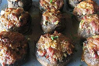 Farcir les champignons, mettre dans un plat allant au four, parsemer de parmesan rapé, fiaire couler un filet d'huile sur les champignons.