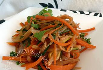 Pelez les carottes et rincez les avec les courgettes sous l’eau claire. Coupez les en tronçons de 5 cm, puis a l’aide d’une mandoline, réalisez des tranches fines. Récupérez ces tranches et taillez les en juliennes. Pelez et émincez finement l’oignon. Dans un wok, faites chauffer les huiles, ajoutez les légumes et faites revenir 5 minutes à feu vif en remuant souvent. Ajoutez la sauce soja, laissez cuire 1 minutes de plus, ajoutez la coriandre, mélangez bien et servez immédiatement.