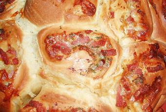 Sortir le pâton sur un plan de travail fariné, dégazer la pâte, l'étaler en un rectangle assez large, déposer dessus des morceaux de fromage, les lardons, et saupoudrer de persil, rouler la pâte en boudin délicatement.