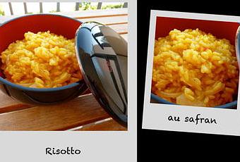 Ingrédients pour 2 personnes: 120g de riz rond (ou "risotto") - 45cl d'eau - 5cl de vin blanc - un cube de bouillon de légumes - un oignon émincé - une CS d'huile d'olive - une pincée de safran