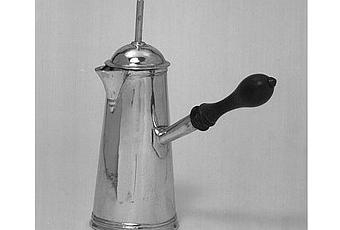 En haut de l’image : chocolatière miniature en argent fabriquée par John Hugh Le Sage en 1740