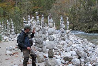 Grâce à Planet Fly Fishing, nous pêchions sur l’Erlauf, en Autriche, quand soudain, dans une courbe on a vu des trucs bizarres, comme des pyramides, nous nous sommes approchés et c’était comme une forêt de galets, des tas de galets érigés vers le ciel comme des sapins pétrifiés. Du pur Land Art, art éphémère qui partira à la première montée des eaux. C’était magique. Quelques heures plus tard nous étions à Paris.