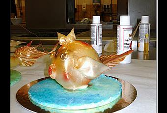 On réalise tout d'abord le corps du poisson. A l'aide d'une pompe à sucre (c'est une sorte de poire en caoutchouc avec un embout en cuivre), on souffle de l'air dans le sucre. On fixe le corps sur le socle.On s'attelle à la création des nageoires. Elles sont réalisées en sucre tiré.On colle les différentes pièces sur le corps du poisson. La dernière étape consiste a décoré notre poisson à l'aide d'un aérographe.