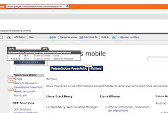 Une nouvelle fonctionnalité sur Google Analytics qui se nomme «Analyse des pages Web» vous permet de facilement visualiser de quelle façon vos visiteurs naviguent et utilisent votre site ou blogue. Lorsque vous activez cette fonction, vous apercevrez une image de votre site sur laquelle apparaîtront en superposition les données liées aux clics qu’ont effectués vos visiteurs.