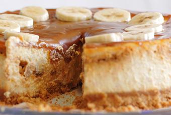 Au moment de servir, recouvrir le cheesecake du reste de sauce au caramel. Couper la banane restante et déposer les tranches sur le dessus pour décorer.