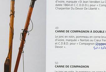 La seconde canne (n° 49) semble aussi douteuse. Elle est ainsi décrite : "CANNE DE COMPAGNON A DOUBLE FERULE. Le jonc en rotin, pommeau en corne brune à pastille d'ivoire, marquée "Nantais au Coeur Fier", datée 1864 et C.D.B.D. pour "Compagnon Charpentier Bon Drille du Devoir". 800 / 1000 €"". Le mot "charpentier" a été biffé et remplacé par "bourrelier", ce qui est juste, mais il aurait fallu aussi rayer "Bon Drille"…
