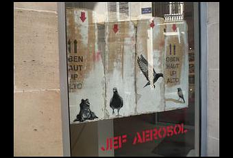 Jef Aérosol y est exposé en ce moment. Portraits au pochoir, à la bombe, du gris, du noir, du rouge. Comme une familiarité avec les personnages saisis sur la toile, qui vous regardent, vous font signe, clins d’œil, sourires. Au point qu’on ne sait plus bien qui est le sujet de l’exposition : les toiles, les murs, le plafond percé, ou le visiteur. Et plaisir de descendre des marches, d’en monter, de se trouver soudain à hauteur d’homme.
